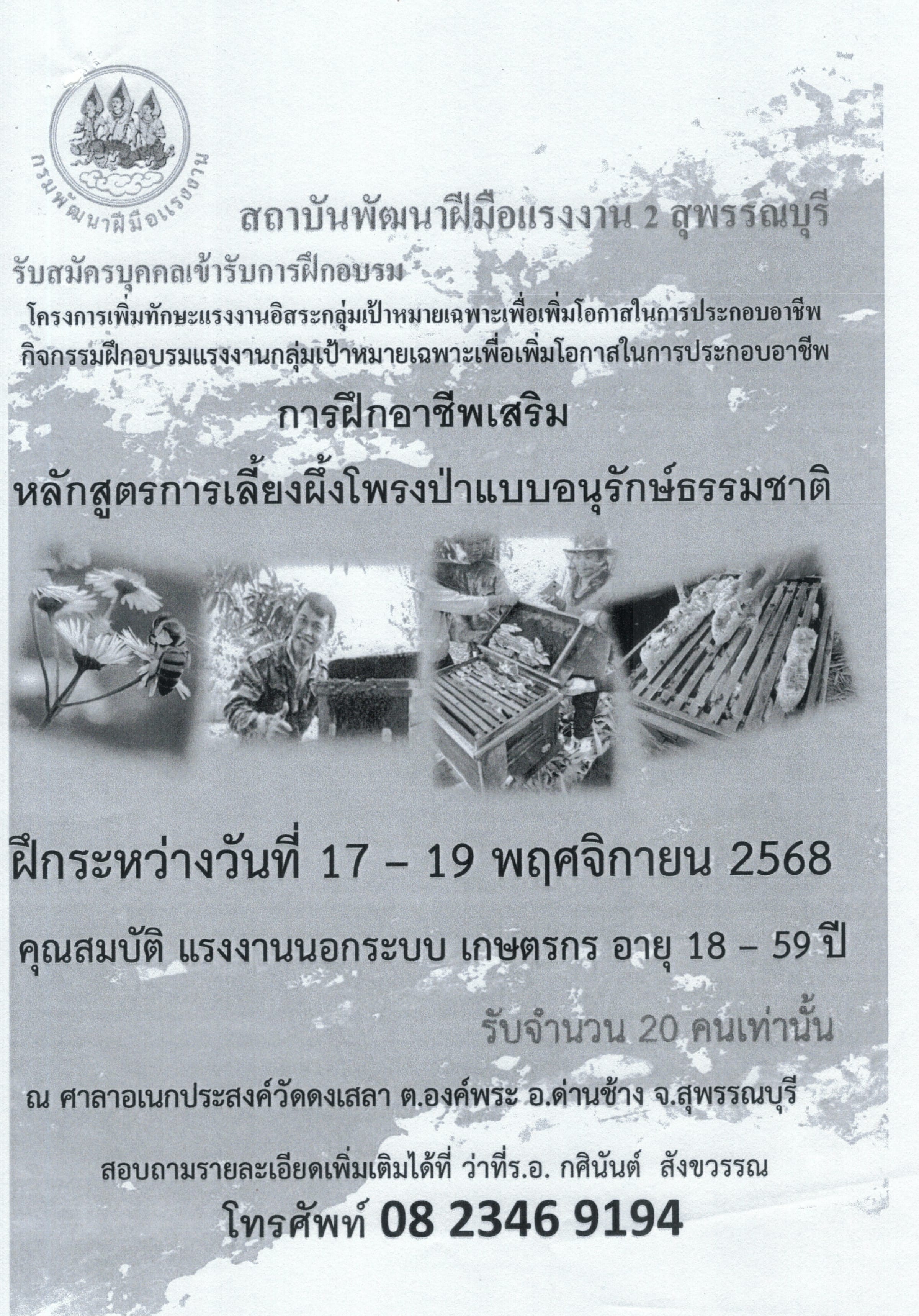 ประชาสัมพันธ์ การฝึกอาชีพหลักสูตรการเลี้ยงผึ้งโพรงป่าแบบอนุรักษ์ธรรมชาติ 17 - 19 พฤศจิกายน 2568