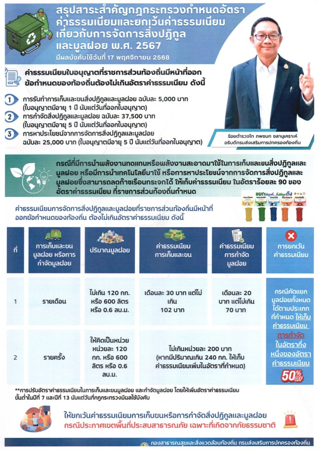 ประชาสัมพันธ์ สรุปสาระสำคัญ ของกฎกระทรวงกำหนดอัตราค่าธรรมเนียมและยกเว้นค่าธรรมเนียมเกี่ยวกับการจัดการสิ่งปฏิกูลและมูลฝอย พ.ศ.2567