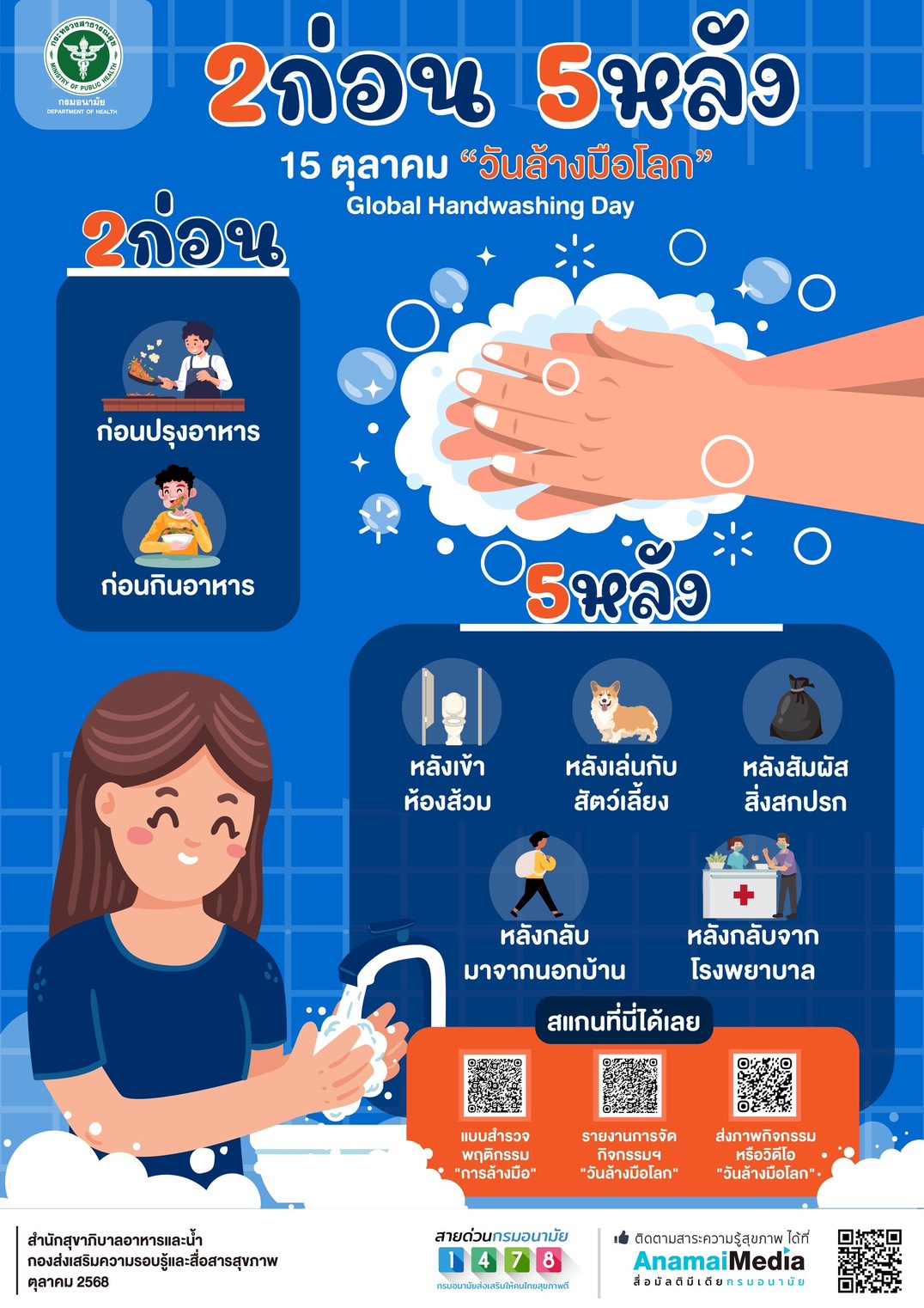 ประชาสัมพันธ์ให้ทุกท่านหมั่นล้างมือด้วยน้ำและสบู่ให้สะอาด 2 ก่อน 5 หลัง เพื่อป้องกันเชื้อโรคเข้าสู่ร่างกาย